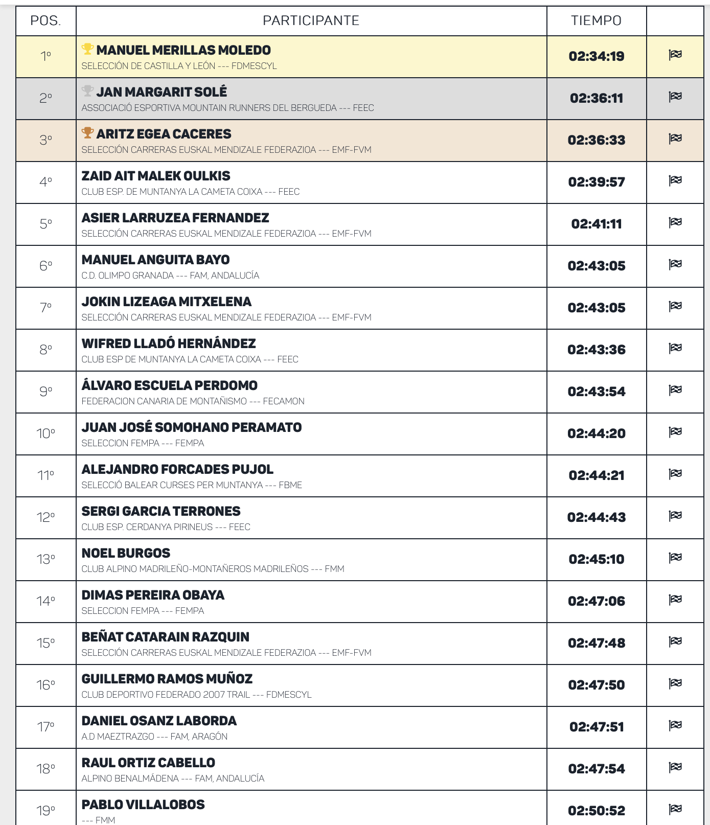 Finalmente Zaid Ait Malek fue cuarto en meta con 02:39:57. Asier Larruzea, quien se hiciera ayer con la medalla de plata en la vertical cierra el TOP5 en la masculina con un tiempo 02:41:11. Muy destacable la actuación de Manu Anguita, líder de Copa de España que es sexto y el ansiado retorno de Jokin Lizeaga con una séptima posición. Wifred Lladó, Alvaro Escuela y Juan José Somohano completaron el top10.