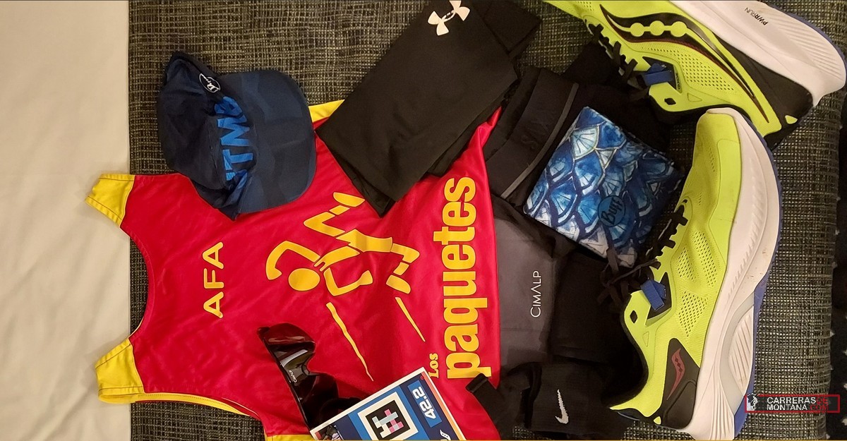 Repetimos con los Pantalones CIMALP AOSTE H, que me van de lujo con su cinturón incorporado para llevar los geles, en la muñeca el reloj COROS VERTIX. Porta dorsabal, camiseta de hombreras de la selección española y Los Paquetes, gorra, buff, y calzoncillos SAXX.